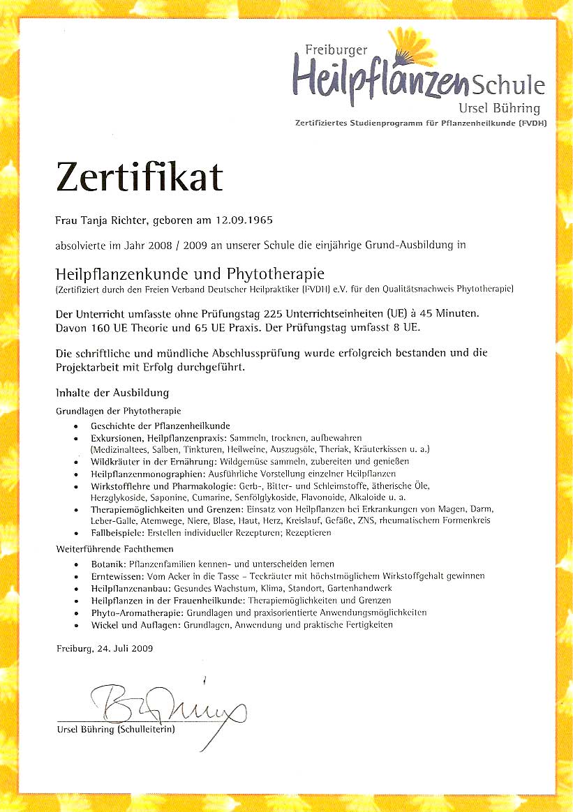 | Heilpflanzenkunde | 2008-2009 | 225 Stunden (2 Jahre) | Freiburg | Heilpflanzen – Zertifikat |