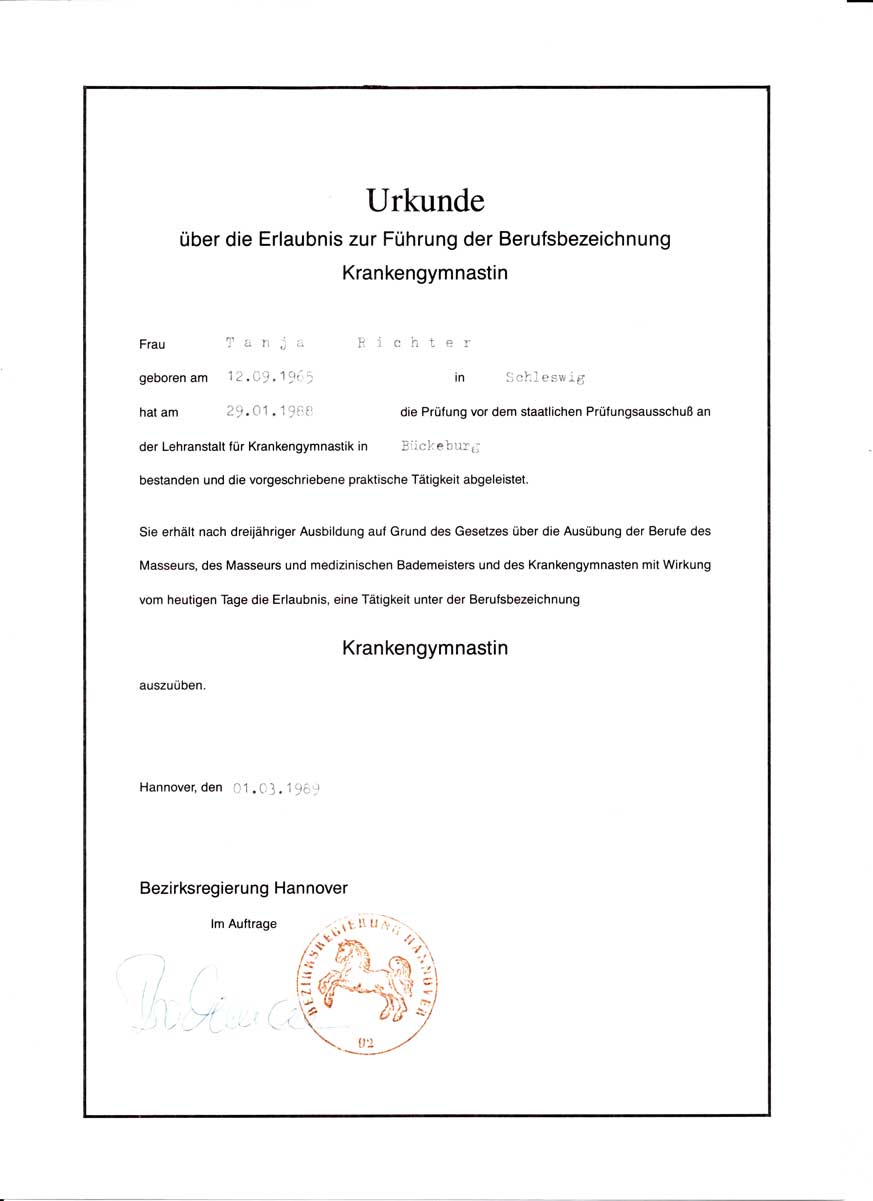 | Krankengymnastin | 1986-89 | 3 Jahre | Bückeburg | Staatsexamen |
