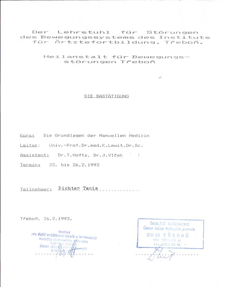 | Manuelle Therapie Prof. Lewit | 1993 | 5 Tage | Trebon (Tschecheslowakei) | Fortbildung |