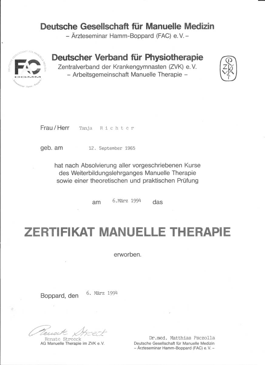 | Manuelle Therapie | 1987-1994 | 6 x 5 Tage in 7 Jahren, 252 Stunden | Boppard und Genk (Belgien) | Manuelle Examen |